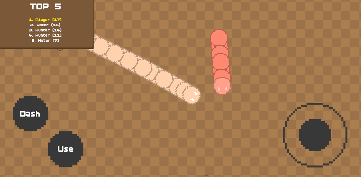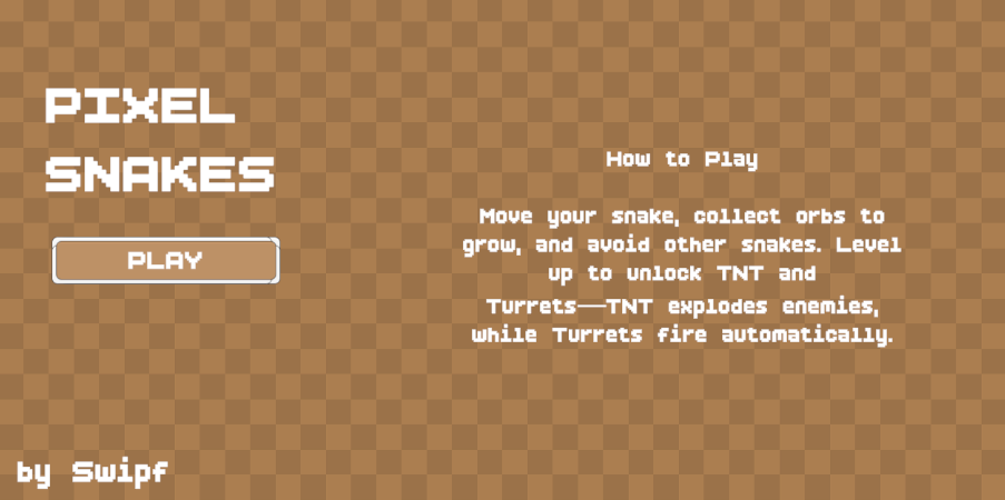 Move your snake, collect orbs to grow, and avoid other snakes. Level up to unlock TNT and Turrets—TNT explodes enemies, while Turrets fire automatically.
